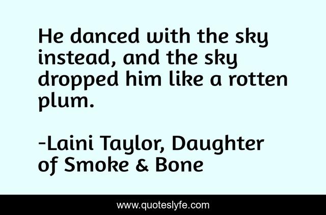 This page presents the quote "He danced with the sky instead, and the sky dropped him like a rotten plum.". Author of this quote is Laini Taylor, Daughter of Smoke & Bone. This quote is about falling, death, metaphor,.
