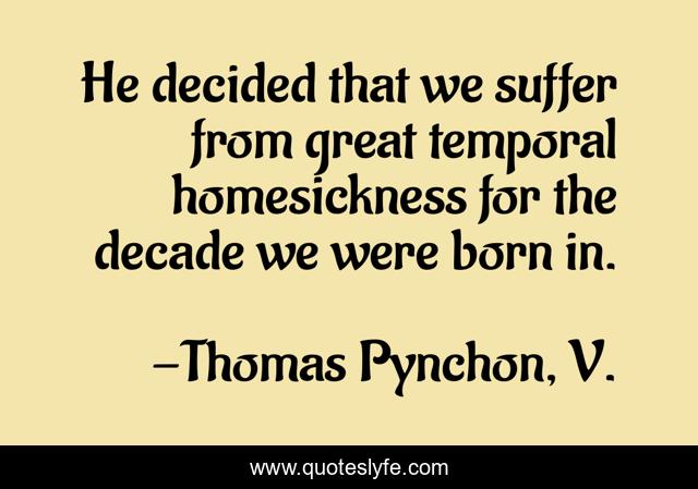 This page presents the quote "He decided that we suffer from great temporal homesickness for the decade we were born in.". Author of this quote is Thomas Pynchon, V.. This quote is about homesickness, nostalgia,.