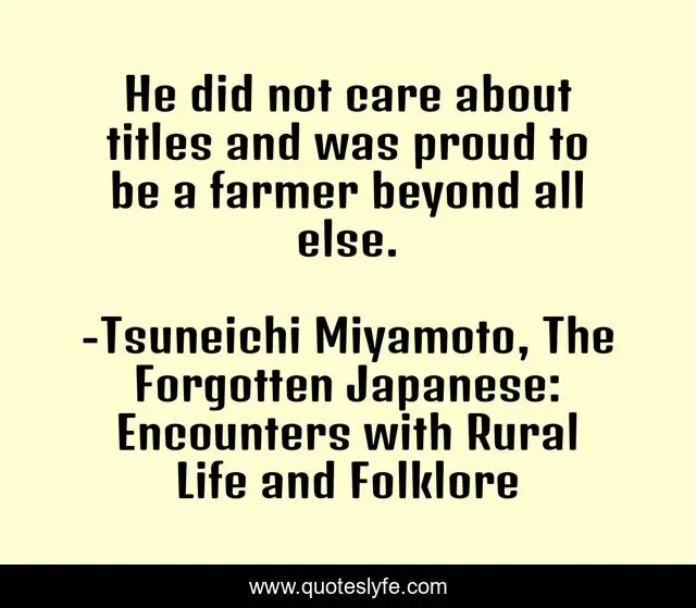 This page presents the quote "He did not care about titles and was proud to be a farmer beyond all else.". Author of this quote is Tsuneichi Miyamoto, The Forgotten Japanese: Encounters with Rural Life and Folklore. This quote is about culture, history, japan,.