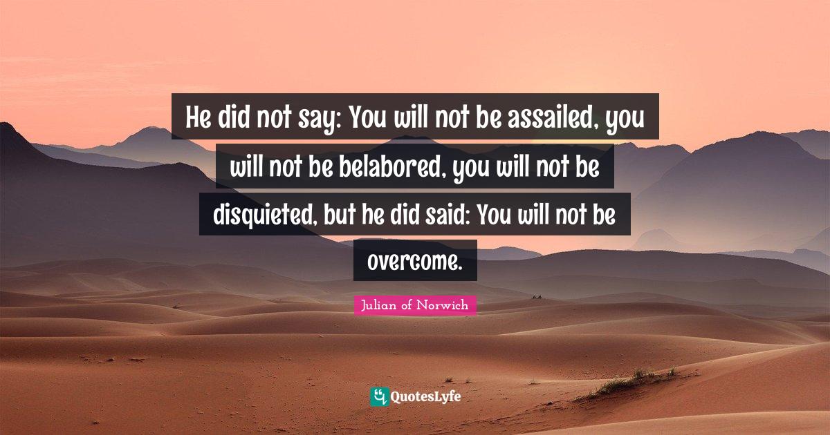 This page presents the quote "He did not say: You will not be assailed, you will not be belabored, you will not be disquieted, but he did said: You will not be overcome.". Author of this quote is Julian of Norwich. This quote is about hope, overcoming, said,.