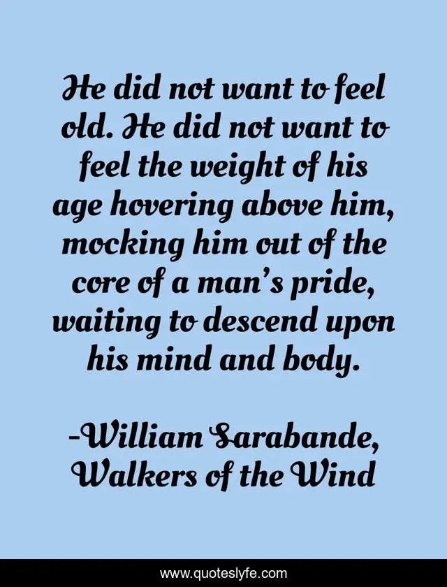 This page presents the quote "He did not want to feel old. He did not want to feel the weight of his age hovering above him, mocking him out of the core of a man’s pride, waiting to descend upon his mind and body.". Author of this quote is William Sarabande, Walkers of the Wind. .