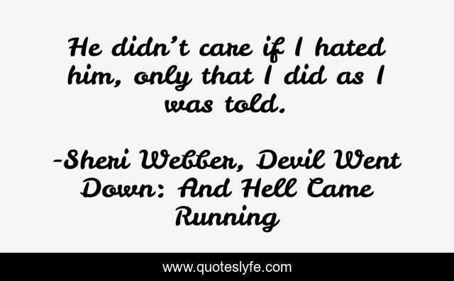 This page presents the quote "He didn’t care if I hated him, only that I did as I was told.". Author of this quote is Sheri Webber, Devil Went Down: And Hell Came Running. This quote is about bible, humor, boss, devil, satan, workplace, employment,.