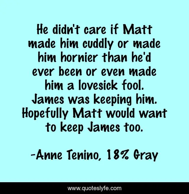 This page presents the quote "He didn't care if Matt made him cuddly or made him hornier than he'd ever been or even made him a lovesick fool. James was keeping him. Hopefully Matt would want to keep James too.". Author of this quote is Anne Tenino, 18% Gray. This quote is about m-m-romance, sci-fi, futuristic,.