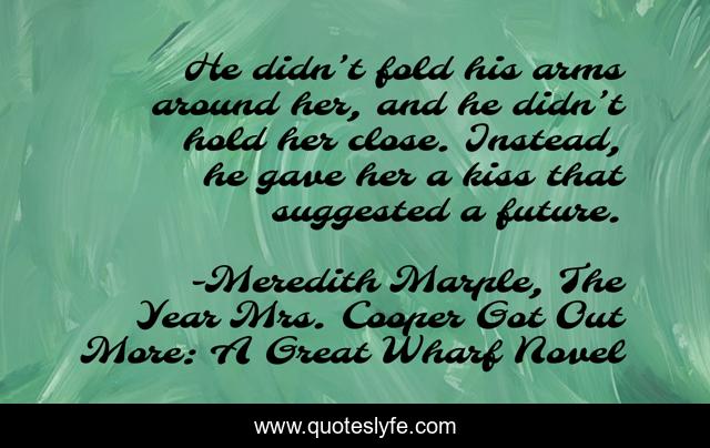 This page presents the quote "He didn’t fold his arms around her, and he didn’t hold her close. Instead, he gave her a kiss that suggested a future.". Author of this quote is Meredith Marple, The Year Mrs. Cooper Got Out More: A Great Wharf Novel. This quote is about future, love, kiss, affection,.