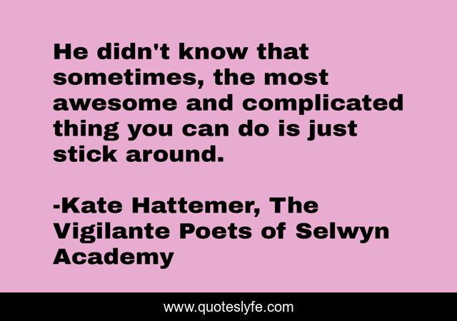 This page presents the quote "He didn't know that sometimes, the most awesome and complicated thing you can do is just stick around.". Author of this quote is Kate Hattemer, The Vigilante Poets of Selwyn Academy. This quote is about enthusiasm, life, deep, inspirational,.