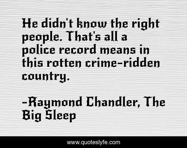 This page presents the quote "He didn't know the right people. That's all a police record means in this rotten crime-ridden country.". Author of this quote is Raymond Chandler, The Big Sleep. This quote is about politics, police, crime,.