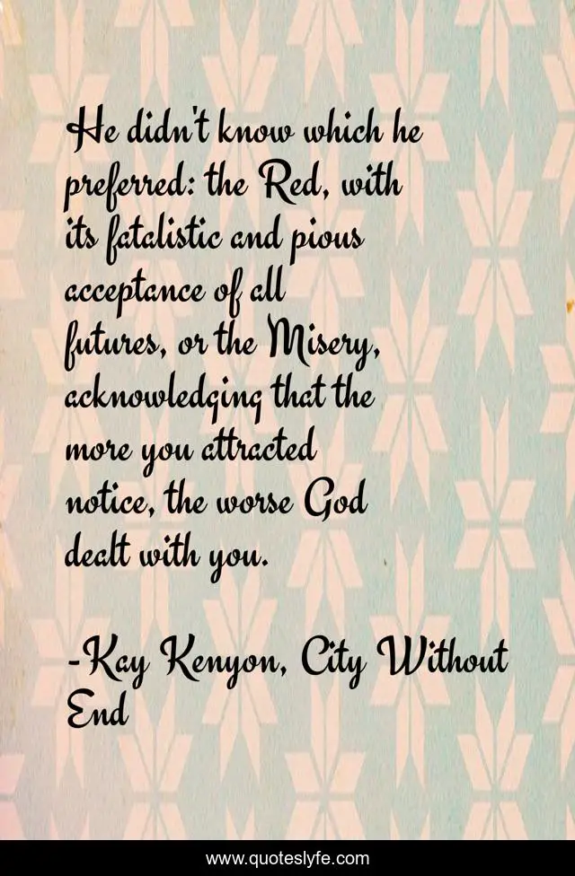 This page presents the quote "He didn't know which he preferred: the Red, with its fatalistic and pious acceptance of all futures, or the Misery, acknowledging that the more you attracted notice, the worse God dealt with you.". Author of this quote is Kay Kenyon, City Without End. .