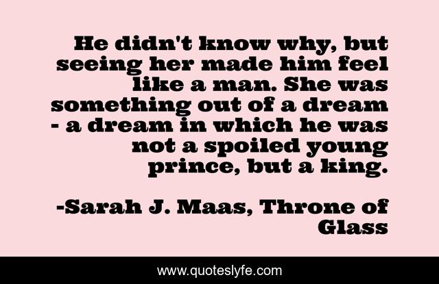 This page presents the quote "He didn't know why, but seeing her made him feel like a man. She was something out of a dream - a dream in which he was not a spoiled young prince, but a king.". Author of this quote is Sarah J. Maas, Throne of Glass. This quote is about king, woman, princes, woman-and-man, kings, manhood, women-and-men, prince, women,.