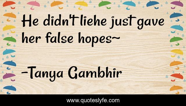 This page presents the quote "He didn't liehe just gave her false hopes~". Author of this quote is Tanya Gambhir. This quote is about relationship, lies, false-hope, quotes, she, hopes, he,.
