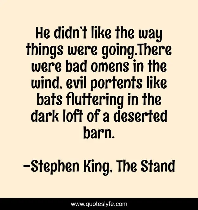 This page presents the quote "He didn’t like the way things were going.There were bad omens in the wind, evil portents like bats fluttering in the dark loft of a deserted barn.". Author of this quote is Stephen King, The Stand. This quote is about prose, darkness,.