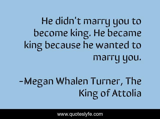 This page presents the quote "He didn't marry you to become king. He became king because he wanted to marry you.". Author of this quote is Megan Whalen Turner, The King of Attolia. This quote is about love, attolia, eugenides, royalty, marriage, affection,.