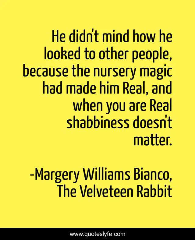 This page presents the quote "He didn't mind how he looked to other people, because the nursery magic had made him Real, and when you are Real shabbiness doesn't matter.". Author of this quote is Margery Williams Bianco, The Velveteen Rabbit. This quote is about modesty, love, affection, humility,.