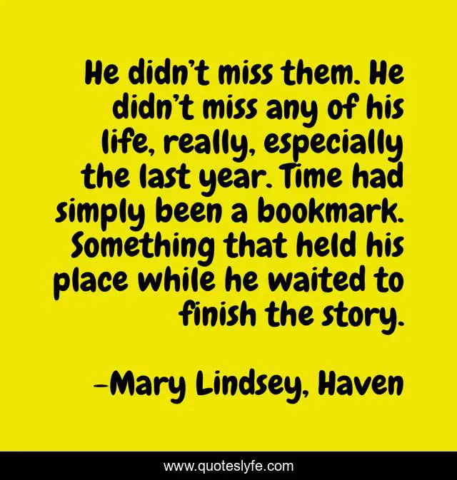 This page presents the quote "He didn’t miss them. He didn’t miss any of his life, really, especially the last year. Time had simply been a bookmark. Something that held his place while he waited to finish the story.". Author of this quote is Mary Lindsey, Haven. This quote is about werewolves, young-adult-romance, paranormal-romance, witches,.
