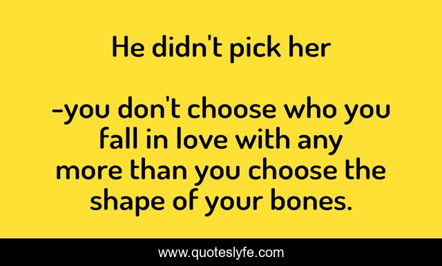 "you don't choose who you fall in love with any more than you choose the shape of your bones. Quotes." Quoteslyfe.com, 2025. Mon. 08 Dec. 2025. <https://www.quoteslyfe.com/quote/He-didn-t-pick-her-188832>.