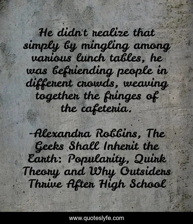 This page presents the quote "He didn't realize that simply by mingling among various lunch tables, he was befriending people in different crowds, weaving together the fringes of the cafeteria.". Author of this quote is Alexandra Robbins, The Geeks Shall Inherit the Earth: Popularity, Quirk Theory and Why Outsiders Thrive After High School. This quote is about unity, influence,.
