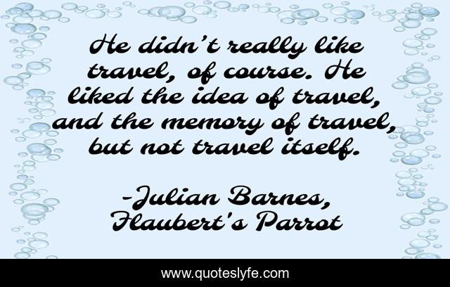 This page presents the quote "He didn’t really like travel, of course. He liked the idea of travel, and the memory of travel, but not travel itself.". Author of this quote is Julian Barnes, Flaubert's Parrot. This quote is about travel, memory,.