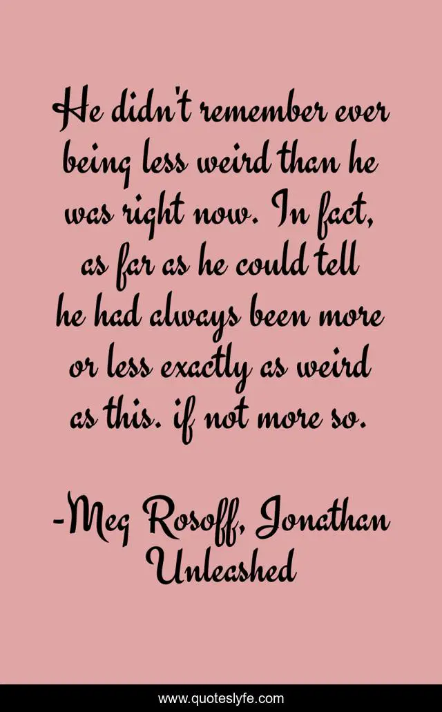 This page presents the quote "He didn't remember ever being less weird than he was right now. In fact, as far as he could tell he had always been more or less exactly as weird as this. if not more so.". Author of this quote is Meg Rosoff, Jonathan Unleashed. This quote is about humor, fiction,.