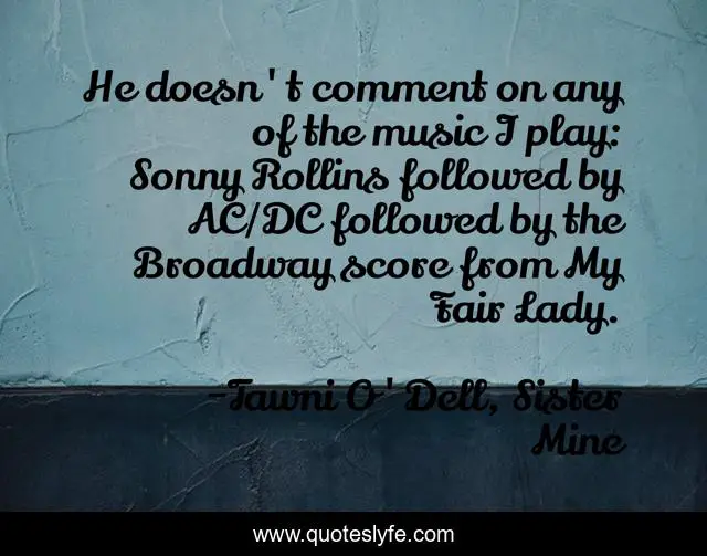 This page presents the quote "He doesn't comment on any of the music I play: Sonny Rollins followed by AC/DC followed by the Broadway score from My Fair Lady.". Author of this quote is Tawni O'Dell, Sister Mine. .