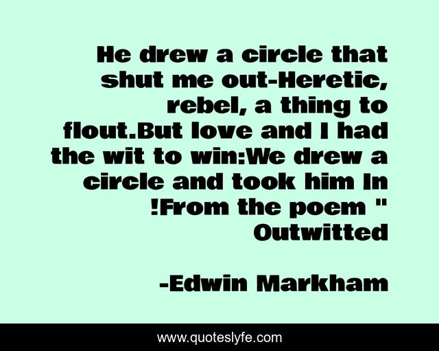 This page presents the quote "He drew a circle that shut me out-Heretic, rebel, a thing to flout.But love and I had the wit to win:We drew a circle and took him In !From the poem " Outwitted". Author of this quote is Edwin Markham. This quote is about heretic, friend, love, poem, wit, rebel, affection,.
