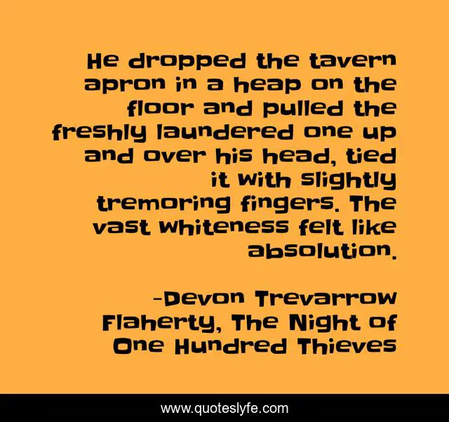 This page presents the quote "He dropped the tavern apron in a heap on the floor and pulled the freshly laundered one up and over his head, tied it with slightly tremoring fingers. The vast whiteness felt like absolution.". Author of this quote is Devon Trevarrow Flaherty, The Night of One Hundred Thieves. .