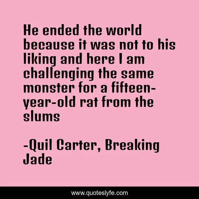 This page presents the quote "He ended the world because it was not to his liking and here I am challenging the same monster for a fifteen-year-old rat from the slums". Author of this quote is Quil Carter, Breaking Jade. This quote is about fearless, love, affection, king,.
