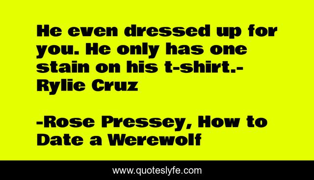 This page presents the quote "He even dressed up for you. He only has one stain on his t-shirt.- Rylie Cruz". Author of this quote is Rose Pressey, How to Date a Werewolf. .