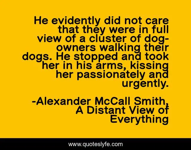 This page presents the quote "He evidently did not care that they were in full view of a cluster of dog-owners walking their dogs. He stopped and took her in his arms, kissing her passionately and urgently.". Author of this quote is Alexander McCall Smith, A Distant View of Everything. This quote is about romance, love, marriage, affection,.