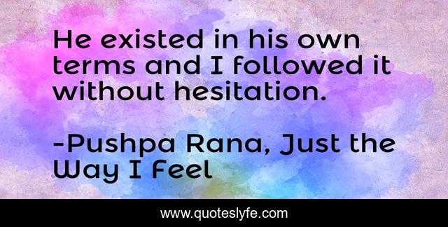 This page presents the quote "He existed in his own terms and I followed it without hesitation.". Author of this quote is Pushpa Rana, Just the Way I Feel. This quote is about love, deep-love, existence, follow, affection, women,.