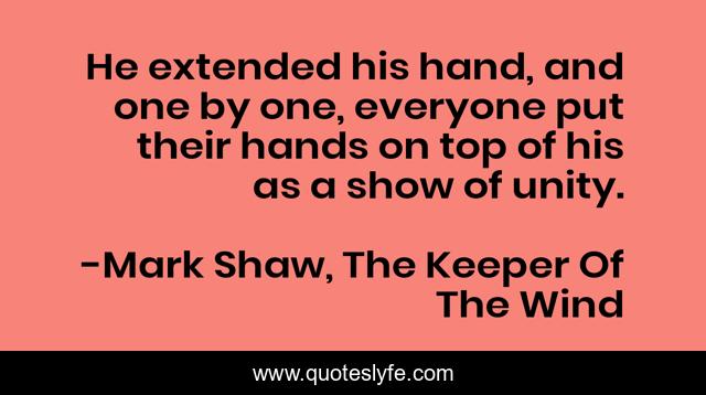This page presents the quote "He extended his hand, and one by one, everyone put their hands on top of his as a show of unity.". Author of this quote is Mark Shaw, The Keeper Of The Wind. This quote is about enthusiasm, unity, friendship, inspirational,.