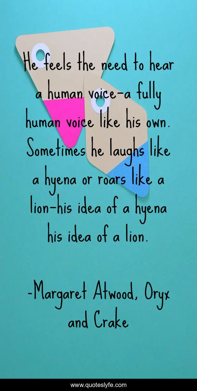 This page presents the quote "He feels the need to hear a human voice—a fully human voice like his own. Sometimes he laughs like a hyena or roars like a lion—his idea of a hyena his idea of a lion.". Author of this quote is Margaret Atwood, Oryx and Crake. This quote is about psychology, distopian,.