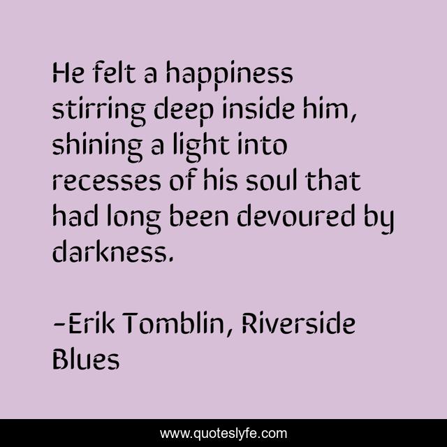 This page presents the quote "He felt a happiness stirring deep inside him, shining a light into recesses of his soul that had long been devoured by darkness.". Author of this quote is Erik Tomblin, Riverside Blues. This quote is about forgotten-memories, love, soulmates, happiness, affection,.