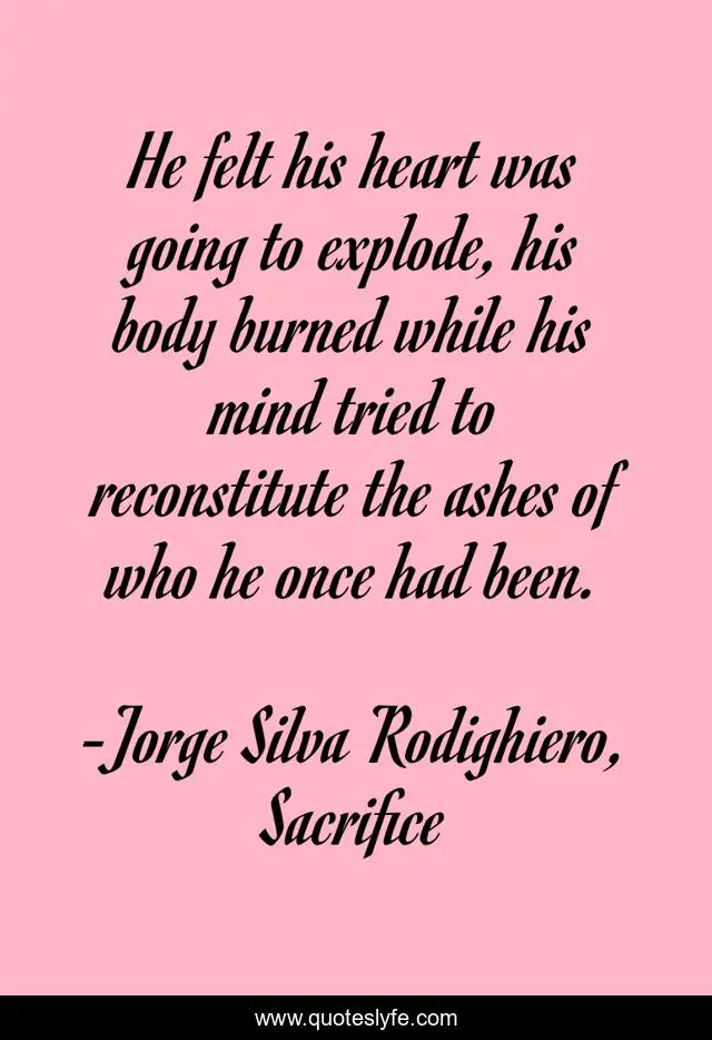 This page presents the quote "He felt his heart was going to explode, his body burned while his mind tried to reconstitute the ashes of who he once had been.". Author of this quote is Jorge Silva Rodighiero, Sacrifice. This quote is about rebirth, death, memory,.