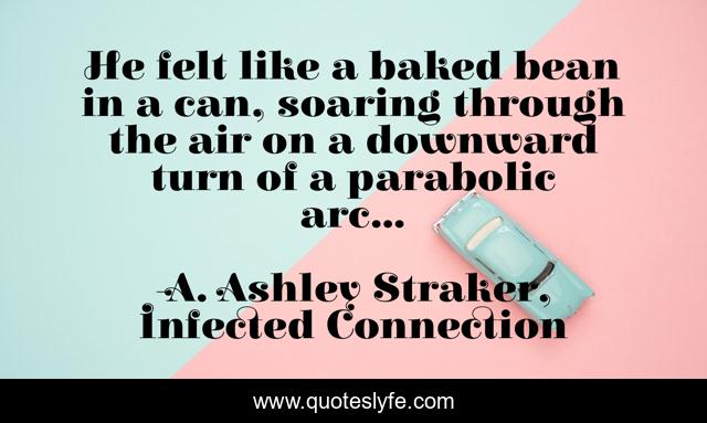 This page presents the quote "He felt like a baked bean in a can, soaring through the air on a downward turn of a parabolic arc...". Author of this quote is A. Ashley Straker, Infected Connection. This quote is about humour, flying, baked-bean, action, fear, thriller,.