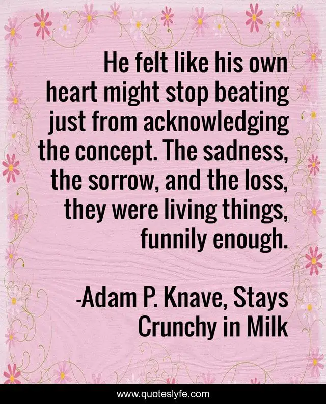 This page presents the quote "He felt like his own heart might stop beating just from acknowledging the concept. The sadness, the sorrow, and the loss, they were living things, funnily enough.". Author of this quote is Adam P. Knave, Stays Crunchy in Milk. This quote is about heart, loss, sorrow, grief, sadness, heartbreak,.