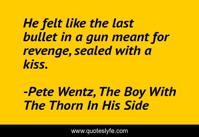 This page presents the quote "He felt like the last bullet in a gun meant for revenge, sealed with a kiss.". Author of this quote is Pete Wentz, The Boy With The Thorn In His Side. This quote is about bullets, guns, revenge,.