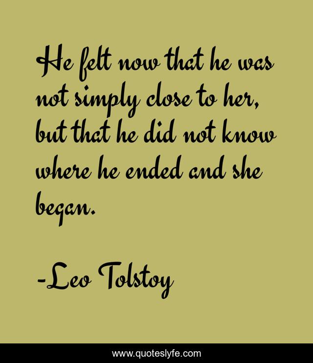 This page presents the quote "He felt now that he was not simply close to her, but that he did not know where he ended and she began.". Author of this quote is Leo Tolstoy. This quote is about closeness, love, affection, soul-mate,.