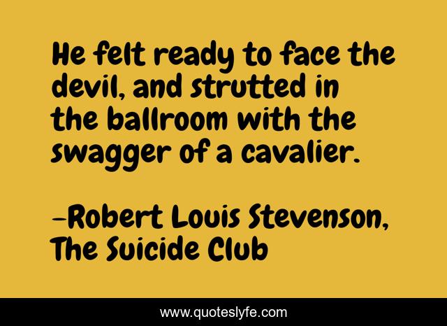 This page presents the quote "He felt ready to face the devil, and strutted in the ballroom with the swagger of a cavalier.". Author of this quote is Robert Louis Stevenson, The Suicide Club. This quote is about fearless, brave, bravery,.