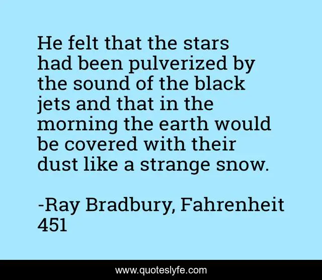 This page presents the quote "He felt that the stars had been pulverized by the sound of the black jets and that in the morning the earth would be covered with their dust like a strange snow.". Author of this quote is Ray Bradbury, Fahrenheit 451. This quote is about star-dust, snow, stars,.