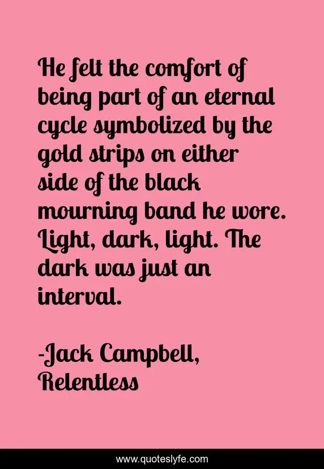 This page presents the quote "He felt the comfort of being part of an eternal cycle symbolized by the gold strips on either side of the black mourning band he wore. Light, dark, light. The dark was just an interval.". Author of this quote is Jack Campbell, Relentless. This quote is about patience, comfort, light-dark, mourning, trials,.