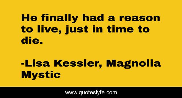 This page presents the quote "He finally had a reason to live, just in time to die.". Author of this quote is Lisa Kessler, Magnolia Mystic. This quote is about contemporary-romance, savannah, card-readings, immortal, pirate-romance, pirates,.