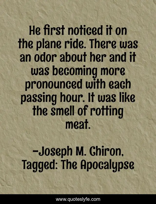 This page presents the quote "He first noticed it on the plane ride. There was an odor about her and it was becoming more pronounced with each passing hour. It was like the smell of rotting meat.". Author of this quote is Joseph M. Chiron, Tagged: The Apocalypse. This quote is about zombie, horror, apocalypse, zombies,.
