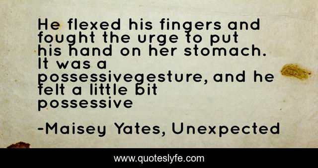 This page presents the quote "He flexed his fingers and fought the urge to put his hand on her stomach. It was a possessivegesture, and he felt a little bit possessive". Author of this quote is Maisey Yates, Unexpected. This quote is about possessive, attraction, love, beginnings, affection,.