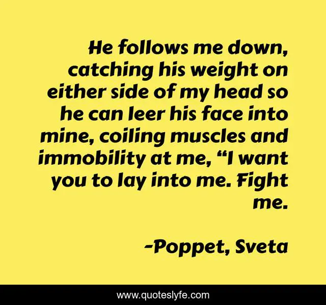 This page presents the quote "He follows me down, catching his weight on either side of my head so he can leer his face into mine, coiling muscles and immobility at me, “I want you to lay into me. Fight me.". Author of this quote is Poppet, Sveta. This quote is about paranormal-romance, vampire-romance,.
