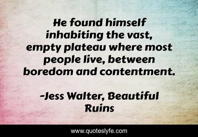 This page presents the quote "He found himself inhabiting the vast, empty plateau where most people live, between boredom and contentment.". Author of this quote is Jess Walter, Beautiful Ruins. .