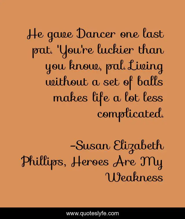 This page presents the quote "He gave Dancer one last pat. 'You're luckier than you know, pal. Living without a set of balls makes life a lot less complicated.". Author of this quote is Susan Elizabeth Phillips, Heroes Are My Weakness. This quote is about desire, relationships, compliated, men, lust, complications,.