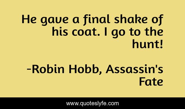 This page presents the quote "He gave a final shake of his coat. I go to the hunt!". Author of this quote is Robin Hobb, Assassin's Fate. This quote is about fool, the-hunt, love, hunt, together, fitz, connection, nighteyes, affection,.