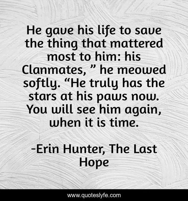 This page presents the quote "He gave his life to save the thing that mattered most to him: his Clanmates, ” he meowed softly. “He truly has the stars at his paws now. You will see him again, when it is time.". Author of this quote is Erin Hunter, The Last Hope. This quote is about warrior-cats, sacrifice, firestar,.