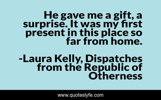 This page presents the quote "He gave me a gift, a surprise. It was my first present in this place so far from home.". Author of this quote is Laura Kelly, Dispatches from the Republic of Otherness. .