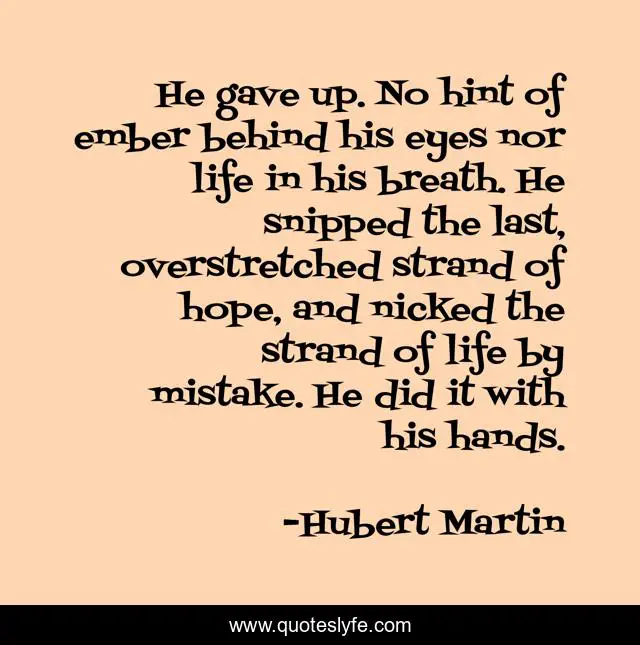 This page presents the quote "He gave up. No hint of ember behind his eyes nor life in his breath. He snipped the last, overstretched strand of hope, and nicked the strand of life by mistake. He did it with his hands.". Author of this quote is Hubert Martin. This quote is about love, honesty, intelligence, deep, sleep, best, poem, confidence, humor,.