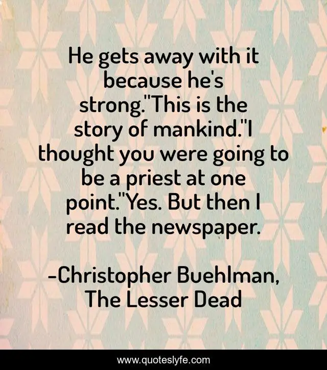 This page presents the quote "He gets away with it because he's strong.''This is the story of mankind.''I thought you were going to be a priest at one point.''Yes. But then I read the newspaper.". Author of this quote is Christopher Buehlman, The Lesser Dead. This quote is about dark, life, death, changed-mind, nature, punish, priest, strong, story,.